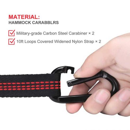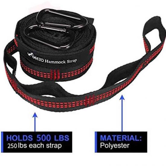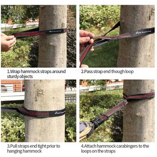 We love the outdoors as much as you do, and we know that camping equipment costs are rising, so we offer the same quality products at lower prices than other popular brands. Setup takes about 1 minute. Wrap the strap around the wood, thread one end of the strap loop through the single loop on the other end and pull tight. Thread the carabiner through one of the hooks, then hook the hammock through the hook, do the same on the other side and you're done!