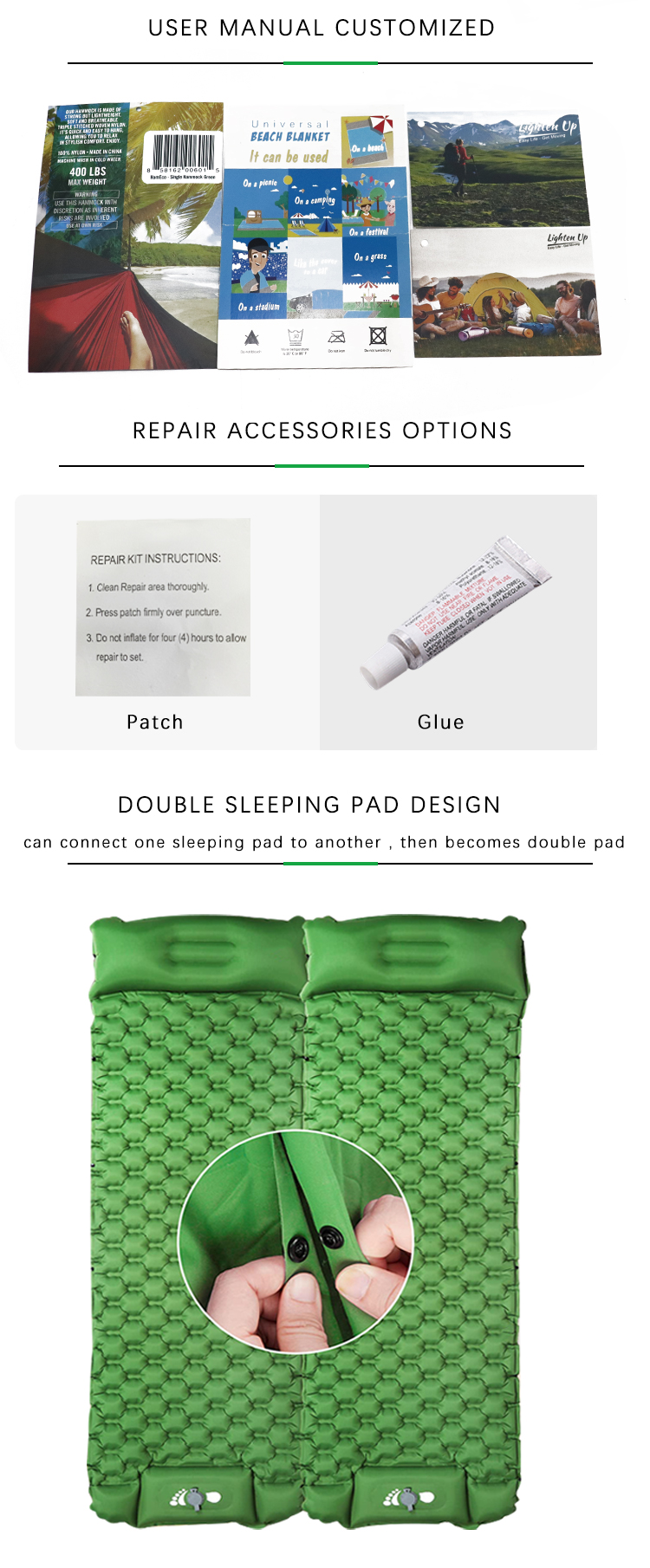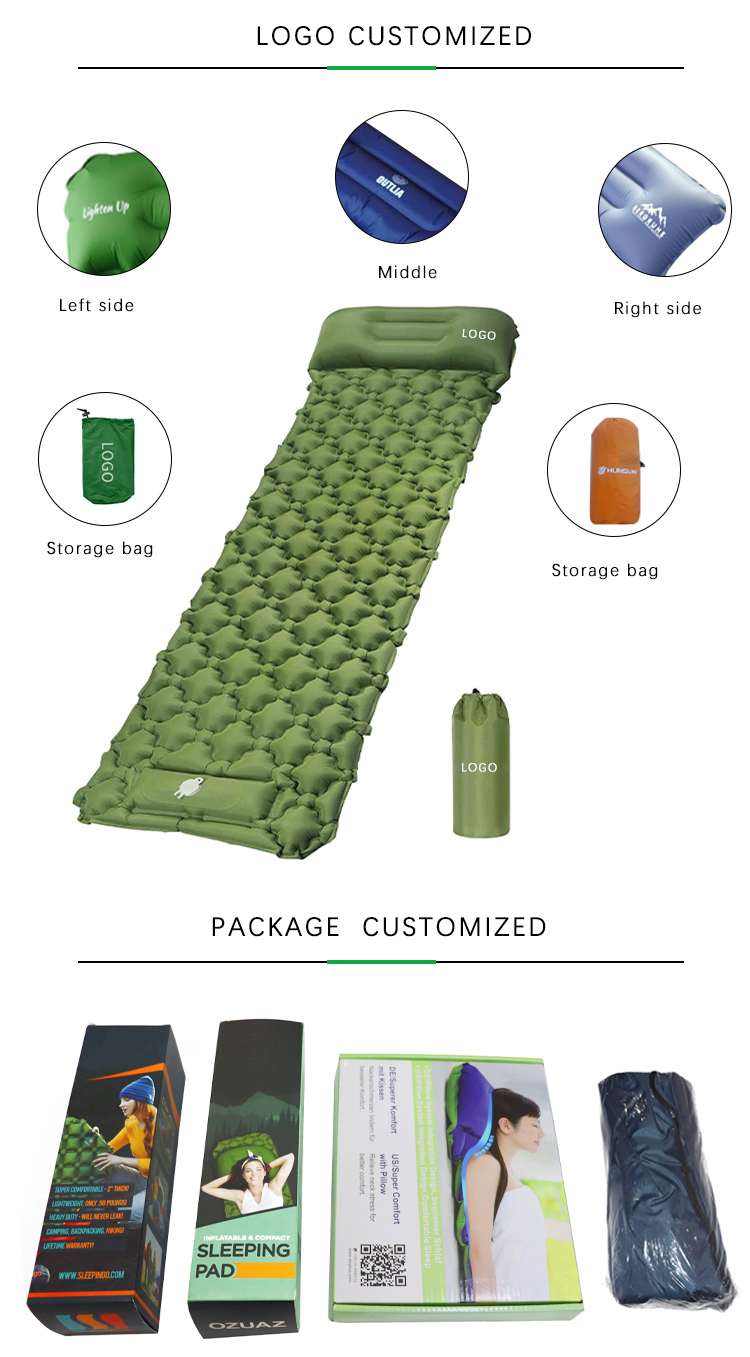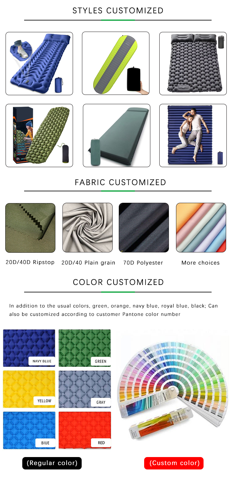 Ultralight Comfortable Waterproof Moisture-proof Nylon Inflatable AirMattress Pad Sleeping Pad For Camping Hiking Sleeping Pad provides campers with comfort and warmth, without requiring them to spend hours inflating it each time they change camps. Thanks to the carefully design, our travel sleeping pad is very suitable for hiking, camping, self-driving tour, fishing and other outdoor activities.