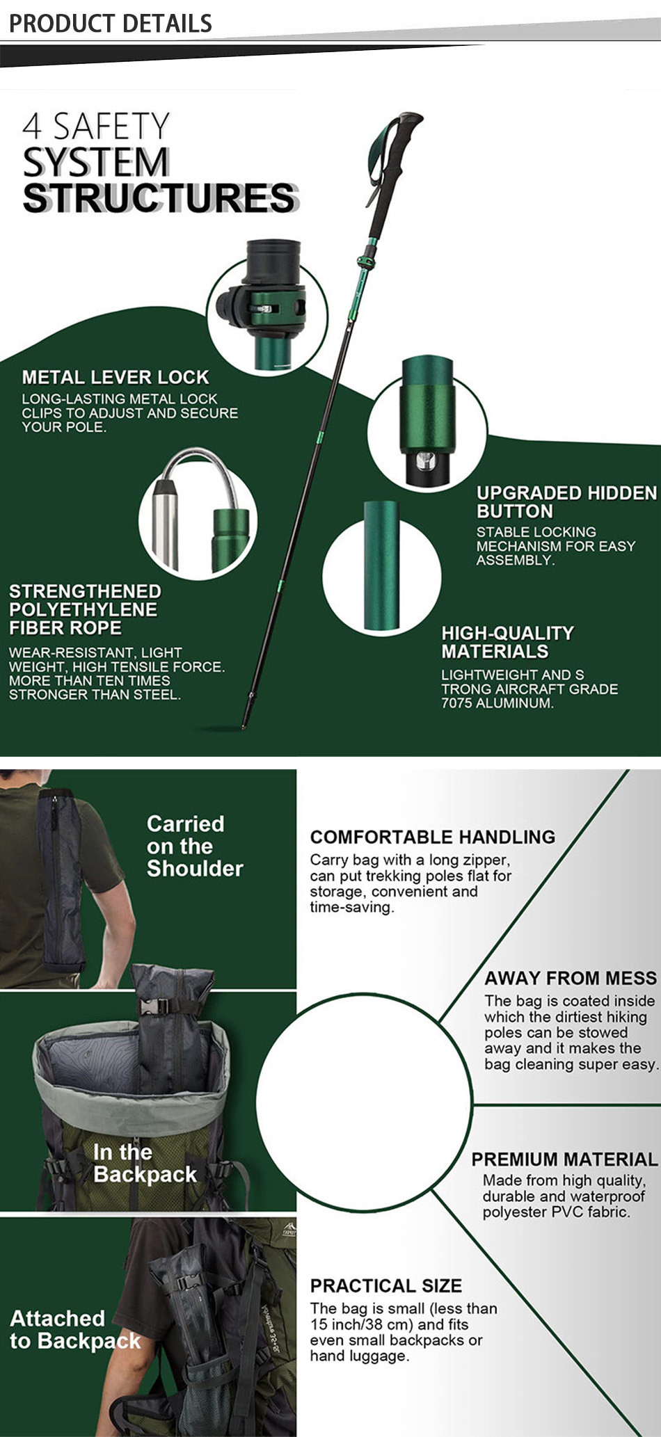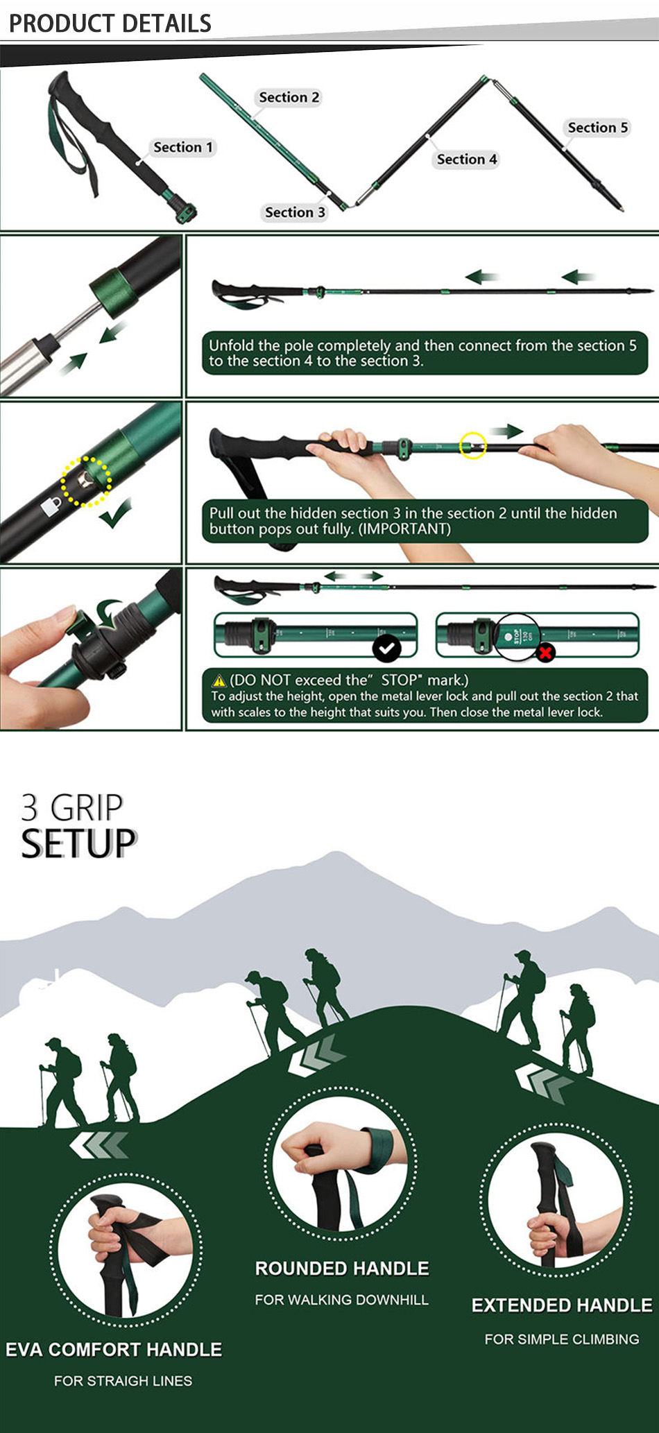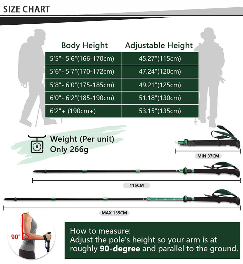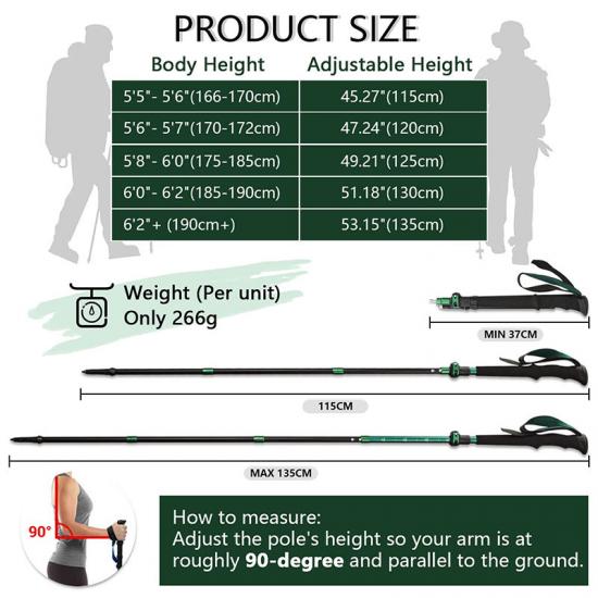 Adopting a combination lock system, this trekking pole combines with quick lock and twist lock, and an anti-shock spring is built in the twist lock area, so the damage impact, you less You can move faster and faster while using energy.With the adjustable height , the walking poles will fit most people.Besides,the Trekking pole with clear graduations and a stop tip that can extend from 25" to 53".It is as small and light as possible.Suitable for all heights, from short to tall men, women and even children! Be careful not to exceed it.