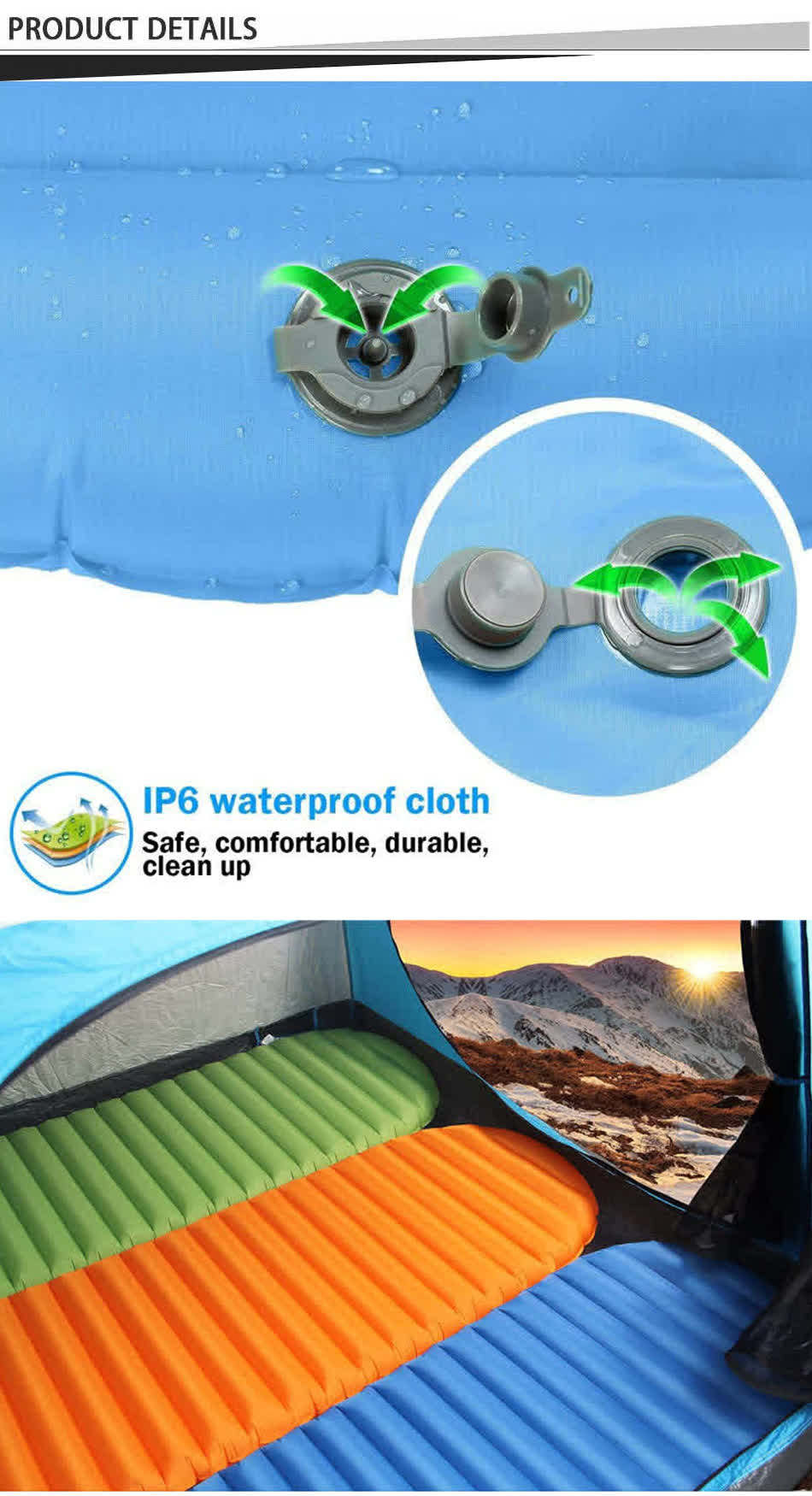 Brand: ANHUI FEISTEL FACTORY Relate Manufacturing: OEM & ODM Product: Durable, self-inflating sleeping pad with splicing capability for customizable comfort, perfect for camping and backpacking in various conditions.