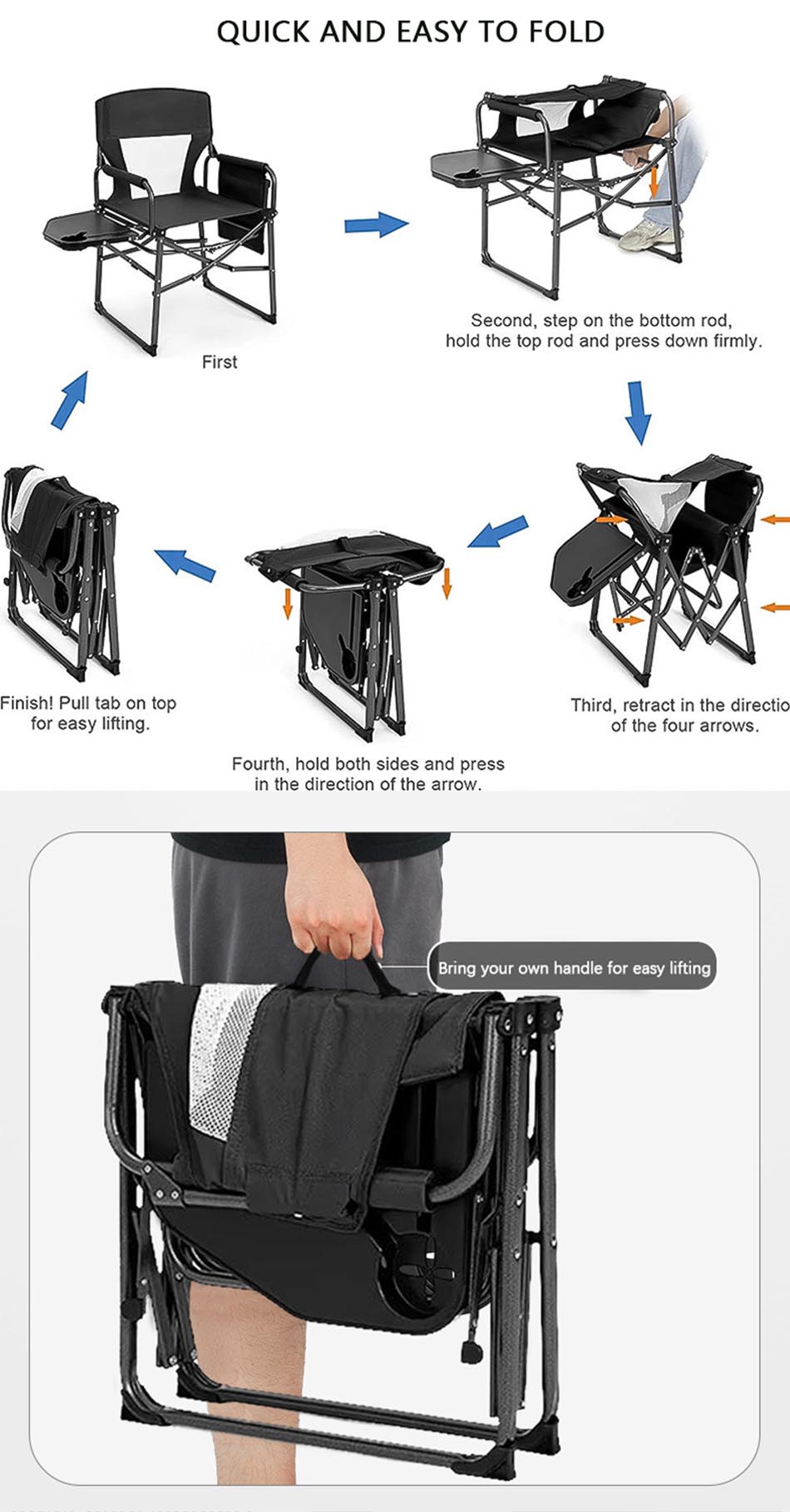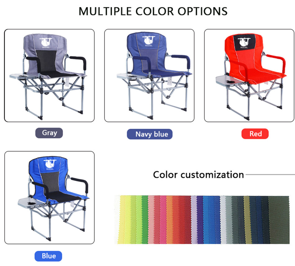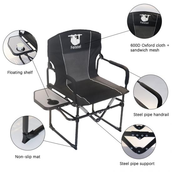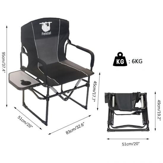 The 600D Oxford Outdoor Relax Portable Director Folding Camping Chair with Side Table is designed for durability and convenience. Constructed with a robust steel pipe bracket and 600D Oxford fabric, it ensures long-lasting use and resistance to wear and tear. This chair features a foldable design, making it easy to transport and store, and includes a side table and storage pouch for added functionality. The reinforced mesh back and padded armrests enhance comfort, while its versatility makes it ideal for camping, fishing, and outdoor activities.