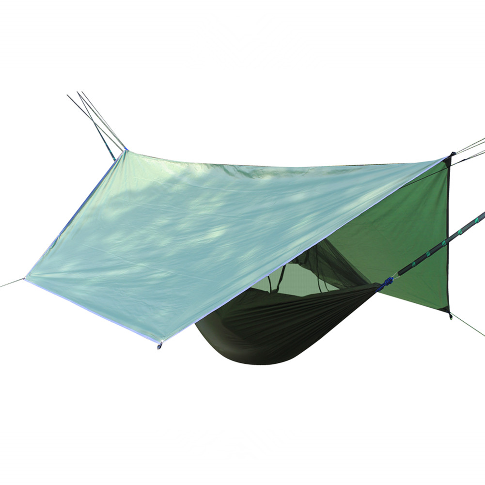 There is not much worse than getting stuck in the rain unprepared. The Feistel Rain Tarp will protect you from the elements during any season so you can always enjoy our beautiful world!From sheltering you on your backpacking, camping and hiking trips to providing you and your family with shade on the beach or covering your barbecue from the rain in your backyard on 4th of July - this hammock tarp is really universal, portable and practical to use.Our Hammock Tarp Shelter comes with four 7075 Aluminum stakes, one person can set it up in about 5 minutes but it also packs small in it’s carry bag so it can become an essential part of your camping and hiking gear.