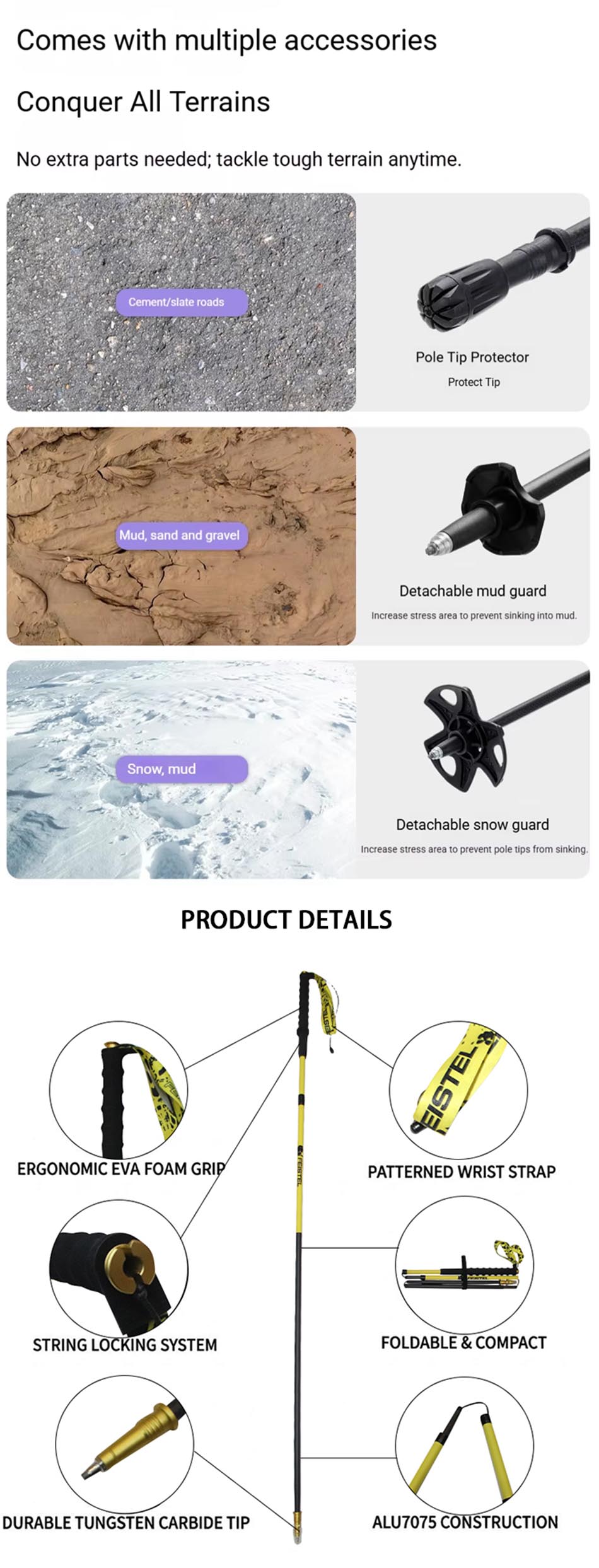 Brand: ANHUI FEISTEL FACTORY Relate Manufacturing: OEM & ODM Product: The ultra-light aluminum 7075 multifunctional foldable walking poles feature durable construction, EVA comfort handles, and compact portability, offering reliable support for outdoor hiking, climbing, trekking, and everyday walking adventures.