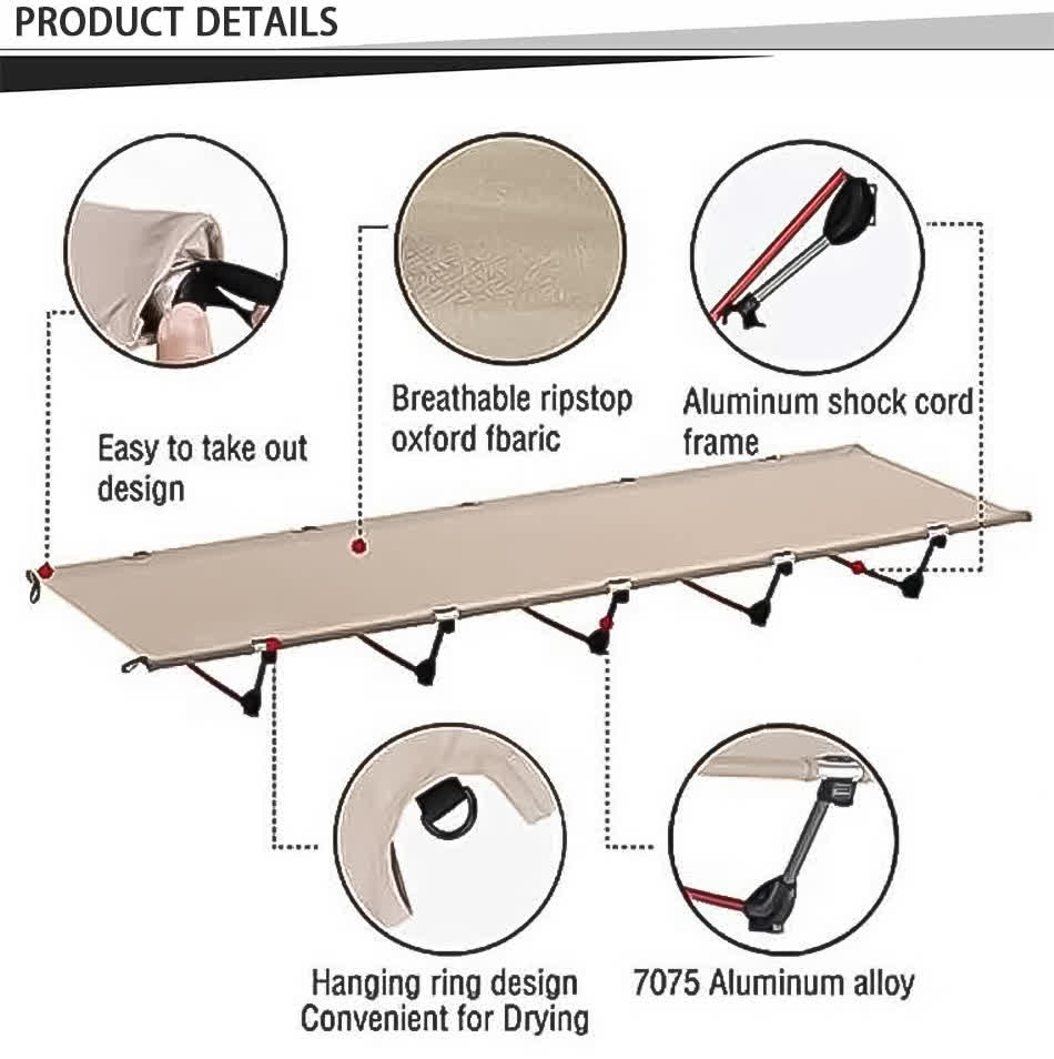 Brand: ANHUI FEISTEL FACTORY Relate Manufacturing: OEM & ODM Product: Lightweight, foldable aluminum bed perfect for camping, picnics, and beach outings. Easy to carry and store, providing comfort and convenience outdoors.