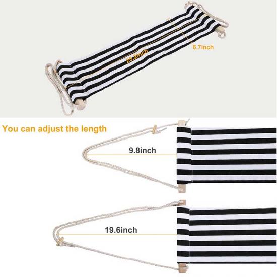 1. The accessories dimensions of this foot hammock are: Rings:88x68x35mm, Cotton rope:1100mm, Wood stick:20x20x2mm, Stopper:40x15x3mm;