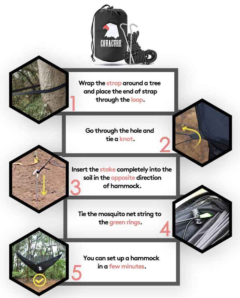 3)【Mounting Accessories】Our outdoor Hammock comes with 2 easy-setup hammock straps +2 carabiners +2 net ropes, No other accessories required
