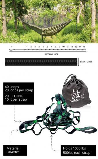 Camping Hammock Tree Straps Set (2 Straps & Carrying Bag), 20 ft Long Combined, 40+2 Loops, 2000 LBS No-Stretch Heavy Duty Straps for Hammock Suspension System Kit
