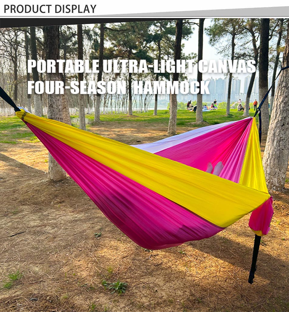 ProductThis amazing camping outdoor lightweight high load bearing anti rollover portable swing leisure double hammock is truly very perfect for relaxing comfortably in the open nature.