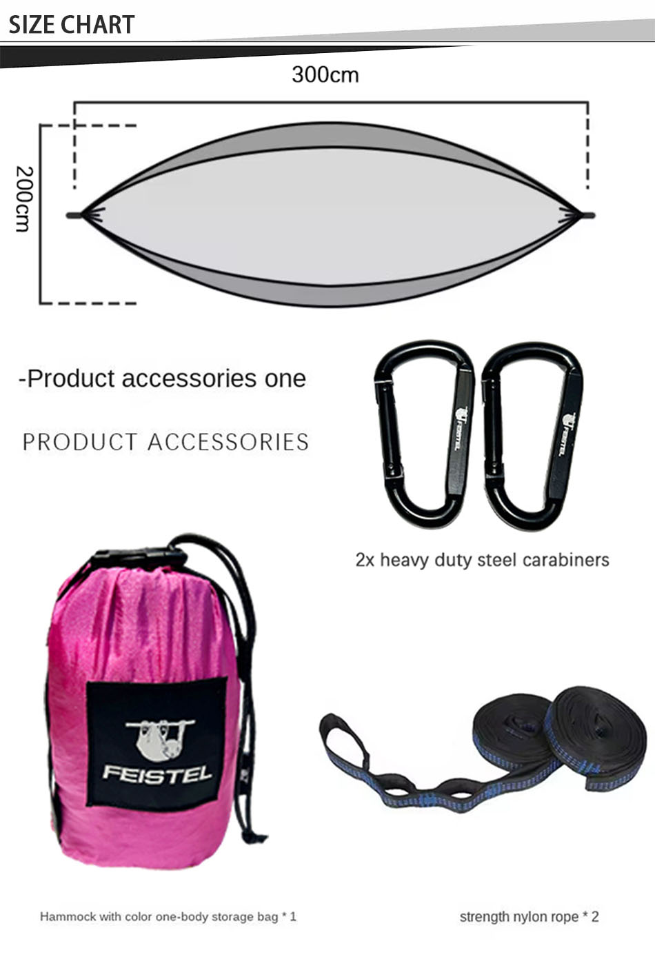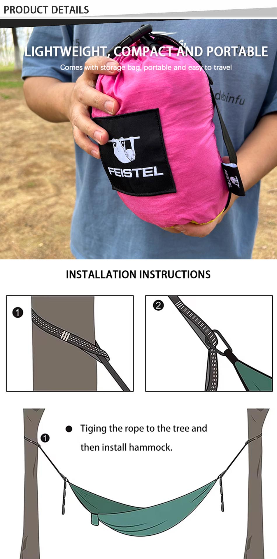 Brand: ANHUI FEISTEL FACTORY Relate Manufacturing: OEM & ODM Product: Camping Hammock Double/Single Portable Hammocks with 2 Tree Straps: Lightweight, durable, easy to set up, perfect for camping, hiking, or relaxing outdoors, supporting ultimate comfort.