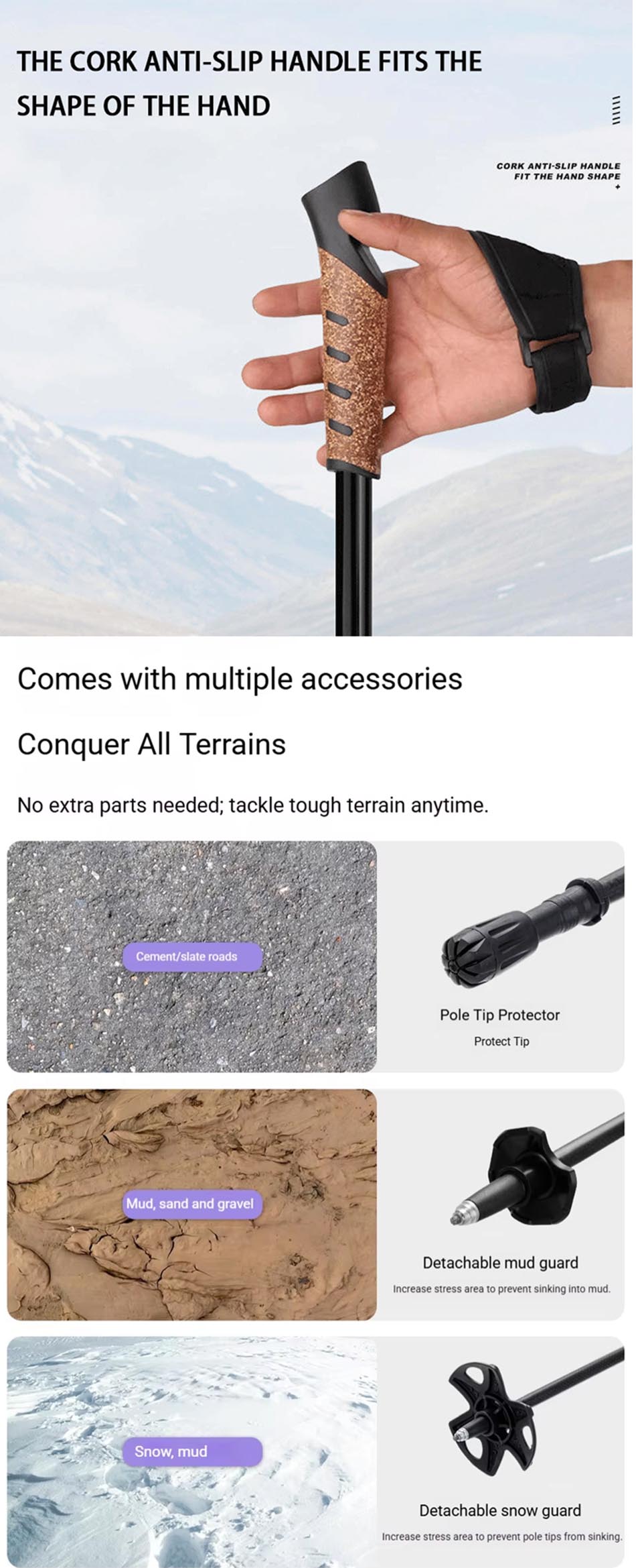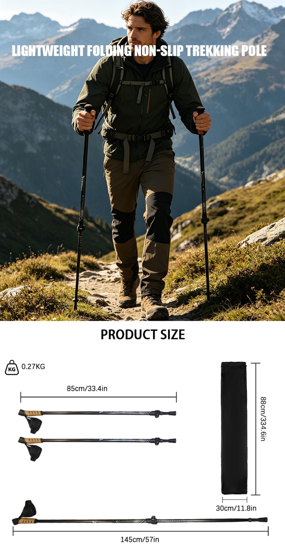 Product: Designed for trail runners and hikers who demand minimal weight and maximum portability, this carbon-fiber alpenstock is ultra-light, easily foldable, and built for reliable performance on rugged sport treks.
