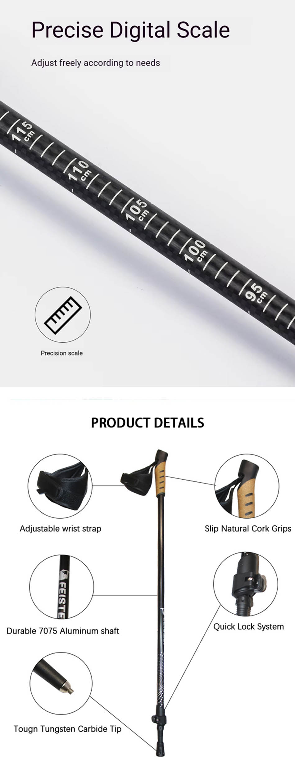 Brand: ANHUI FEISTEL FACTORY Relate Manufacturing: OEM & ODM Product: Lightweight and durable carbon trekking cane, retractable design, ergonomic grip, anti-slip tip, adjustable height, shock absorption, ideal for hiking, climbing, trekking, and outdoor adventures.