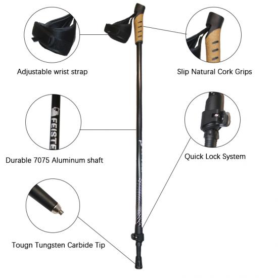 Brand: ANHUI FEISTEL FACTORY Relate Manufacturing: OEM & ODM Product: Lightweight and durable hiking trekking pole made from 7075 duralumin aluminum. Provides stability, shock absorption, and adjustable height for comfortable walking on all terrains.