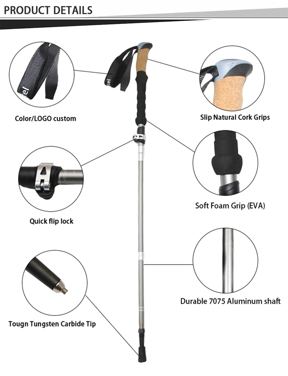ProductCustom 5-section 7075 aviation aluminum trekking poles feature a cork handle, folding design, secure strap, and OEM options for durable, lightweight, and versatile walking and hiking performance.