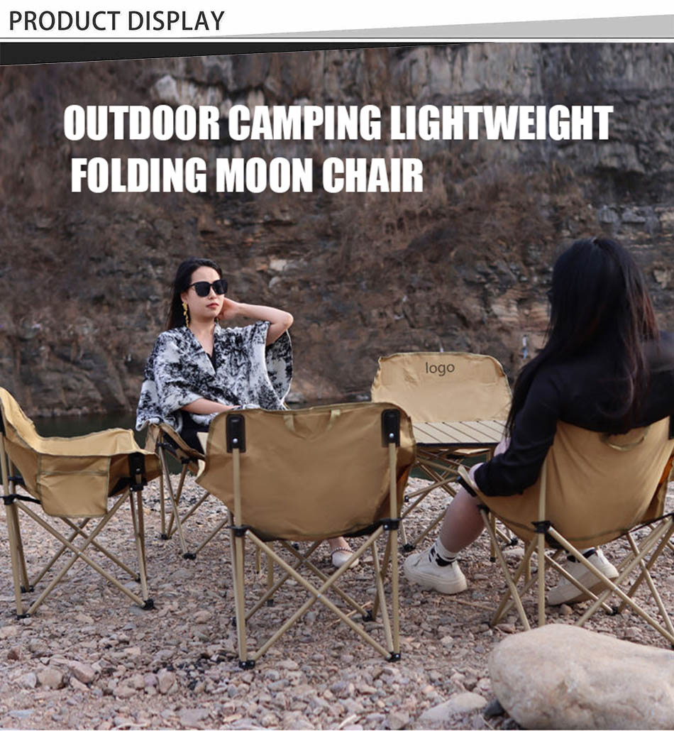 Product: Custom Color Logo Portable Folding Camping Moon Chair — lightweight, compact, and perfect for fishing, beach trips, outdoor adventures, and backyard relaxation.