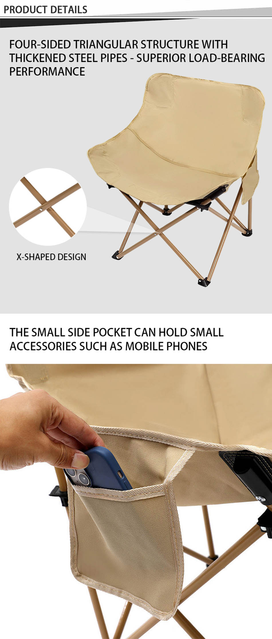 Brand: ANHUI FEISTEL FACTORY Relate Manufacturing: OEM & ODM Product: This portable camping chair features a lightweight, foldable design with durable construction and convenient side pockets, perfect for beach trips, camping, and outdoor relaxation.