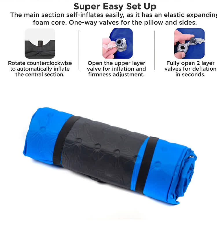 When in use, just open the vent hole and the Single Self-Inflate Sleeping Pad can automatically inflate, making it convenient and fast. At the same time, the thickness and width of the cushion can also provide sufficient support and sleep comfort. There are two styles here: a 3cm thick inflatable cushion and a 5cm thick inflatable cushion. When camping, bringing an outdoor camping automatic inflatable cushion can not only help you enjoy better sleep, but also help alleviate physical discomfort caused by road fatigue.