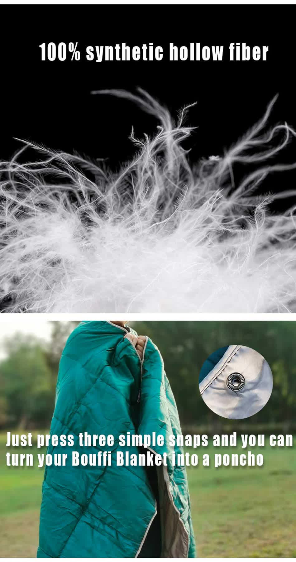 Product: Durable, foldable, and waterproof camping blanket made from nylon with down insulation. Wearable design ensures warmth and versatility outdoors.