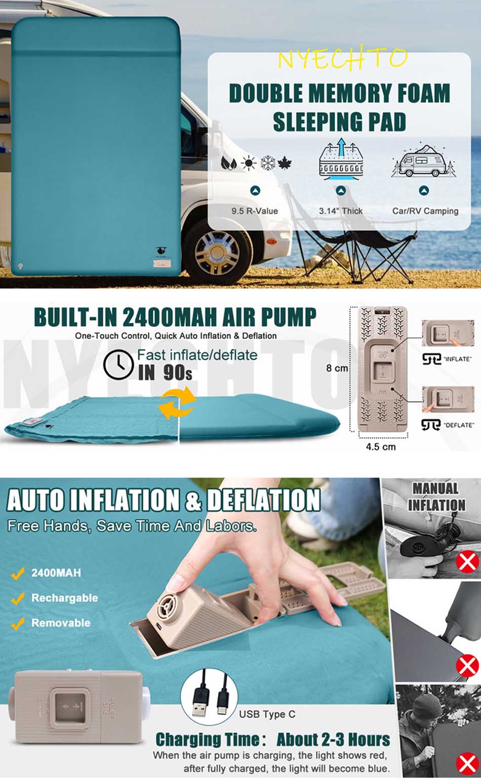 The Ultra Thick Memory Self Inflatable Camping Mattress Sleeping Pad with Electric Pump offers superior comfort and convenience for outdoor adventures. Featuring ultra-thick memory foam (3-4 inches), it provides excellent support and insulation, ensuring a comfortable night's sleep, even on rugged terrain. The built-in electric pump enables fast and effortless inflation and deflation, typically within 20-30 seconds. Its durable, high-density foam construction provides stability and prevents sinking into the ground. Additionally, the self-inflating design makes it quick to set up without manual pumping. Suitable for all seasons, the pad’s lightweight and compact design allows for easy transportation and storage, making it perfect for camping, hiking, and road trips. Ideal for individuals or couples seeking comfort and durability outdoors.