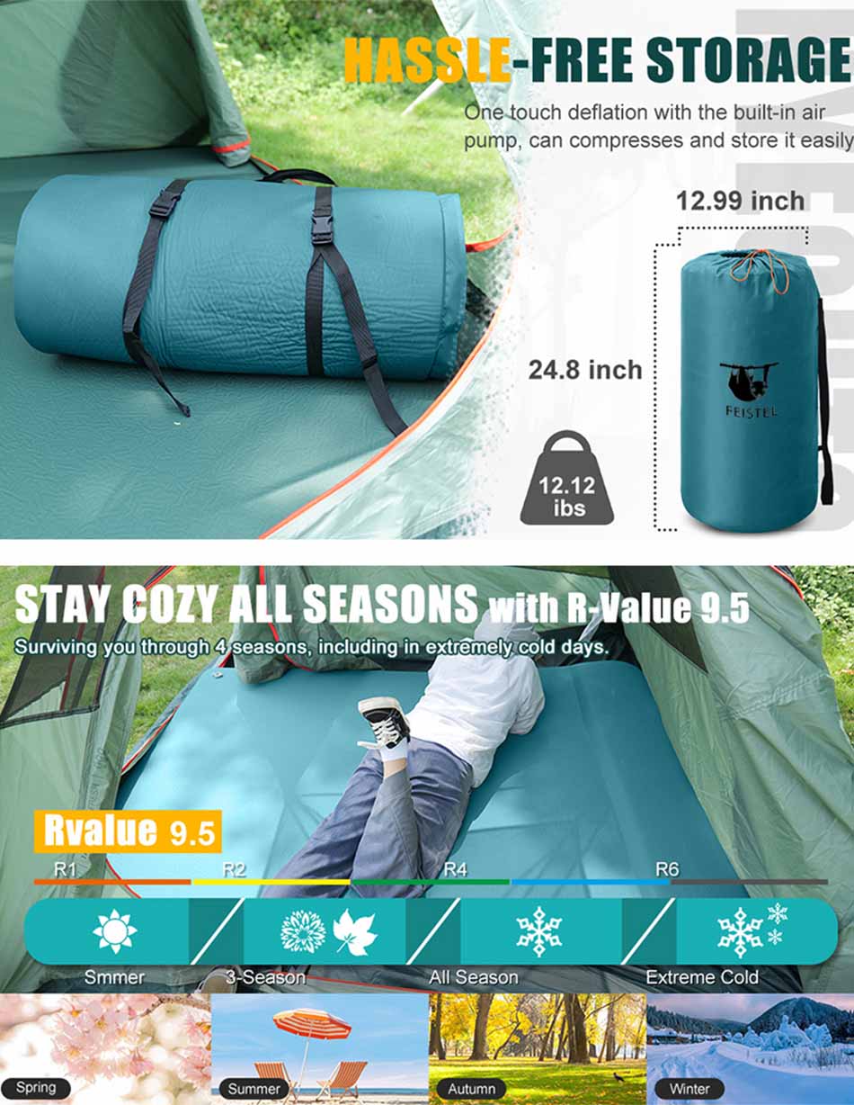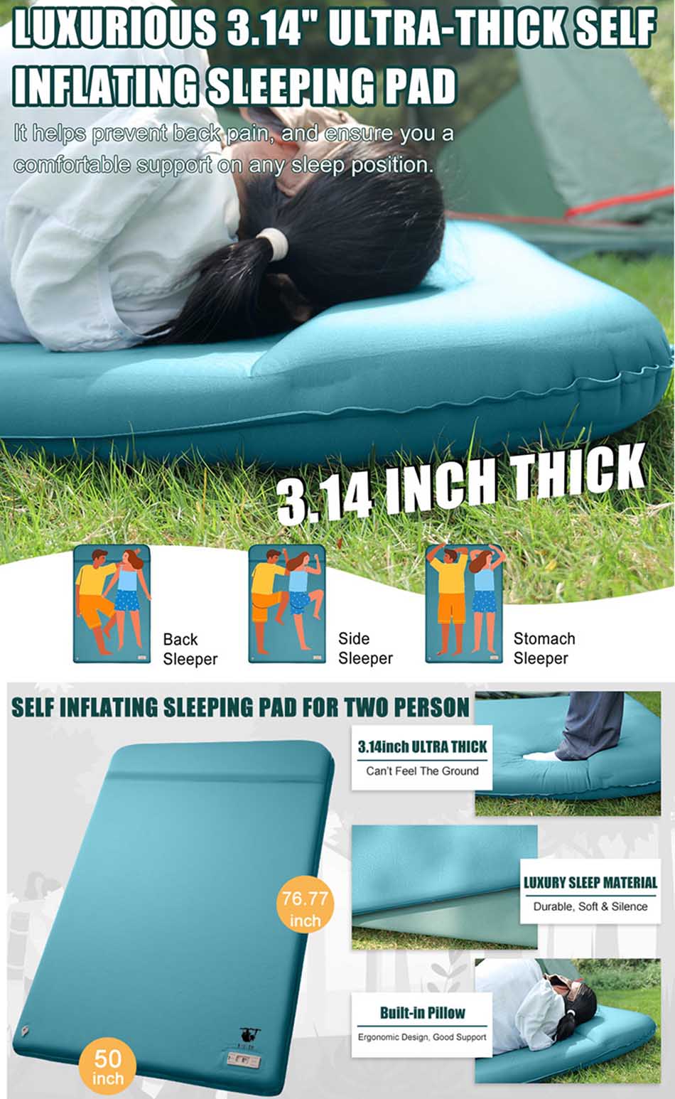 Brand: ANHUI FEISTEL FACTORY Relate Manufacturing: OEM & ODM Product: Portable double sleeping mat with built-in air pillow, easy inflation, lightweight, compact, perfect for camping, hiking, and backpacking.