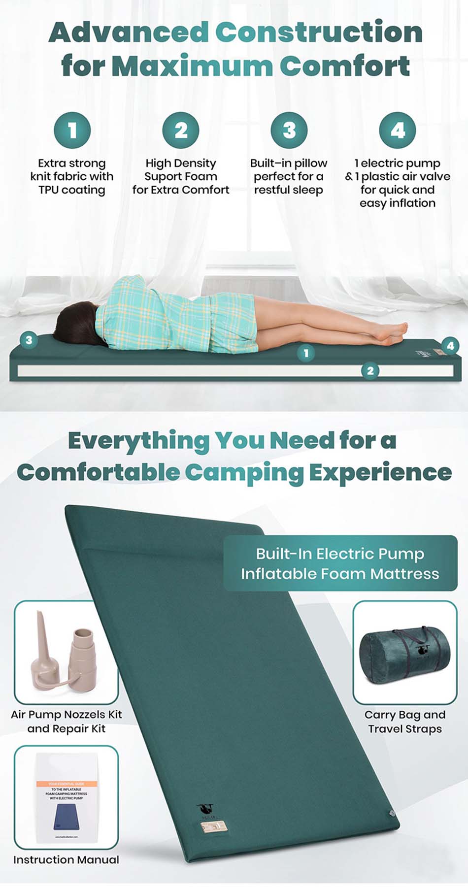 ProductDurable double inflatable mattress with built-in electric pump for effortless camping setup. Comfortable, waterproof, ideal for outdoor adventures or guest accommodations.