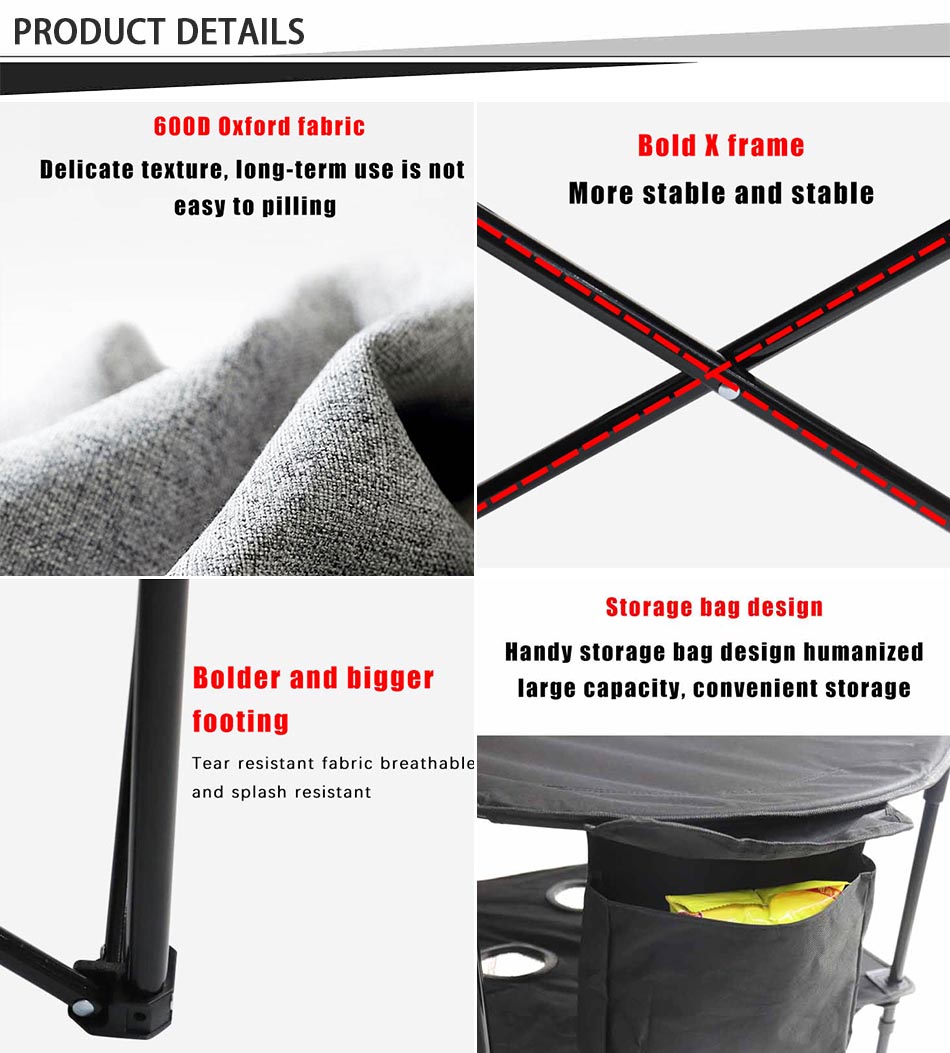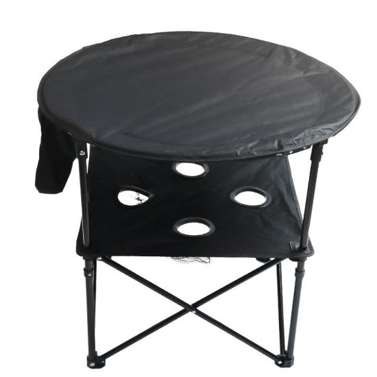 Product: A double-decker folding table with cloth surface, featuring built-in cup holders. Ideal for outdoor activities, providing convenience and portable functionality.