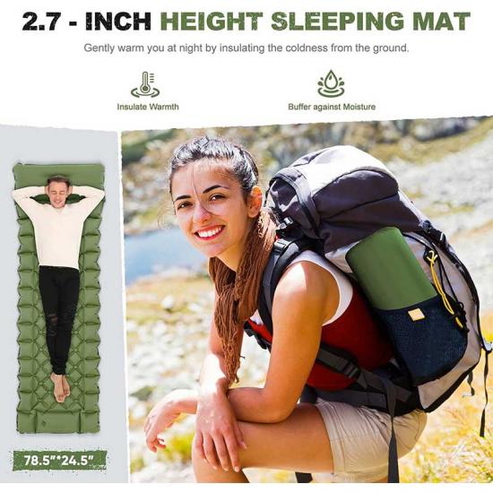 With the design of ergonomic texture,The surface of the sleeping pad is more comfortable and smooth. Whats more, the combination of ultra-thick 40D nylon and TPU's eco-friendly material improves people's sleep and balance. Made from high quality waterproof and tear resistant materials,Our sleeping pads are stress-free and comfortable sleep wherever you are outdoors.The Lightweight camping mats are a must for travel and camping and are ideal for outdoor hiking, backpacking and so on.