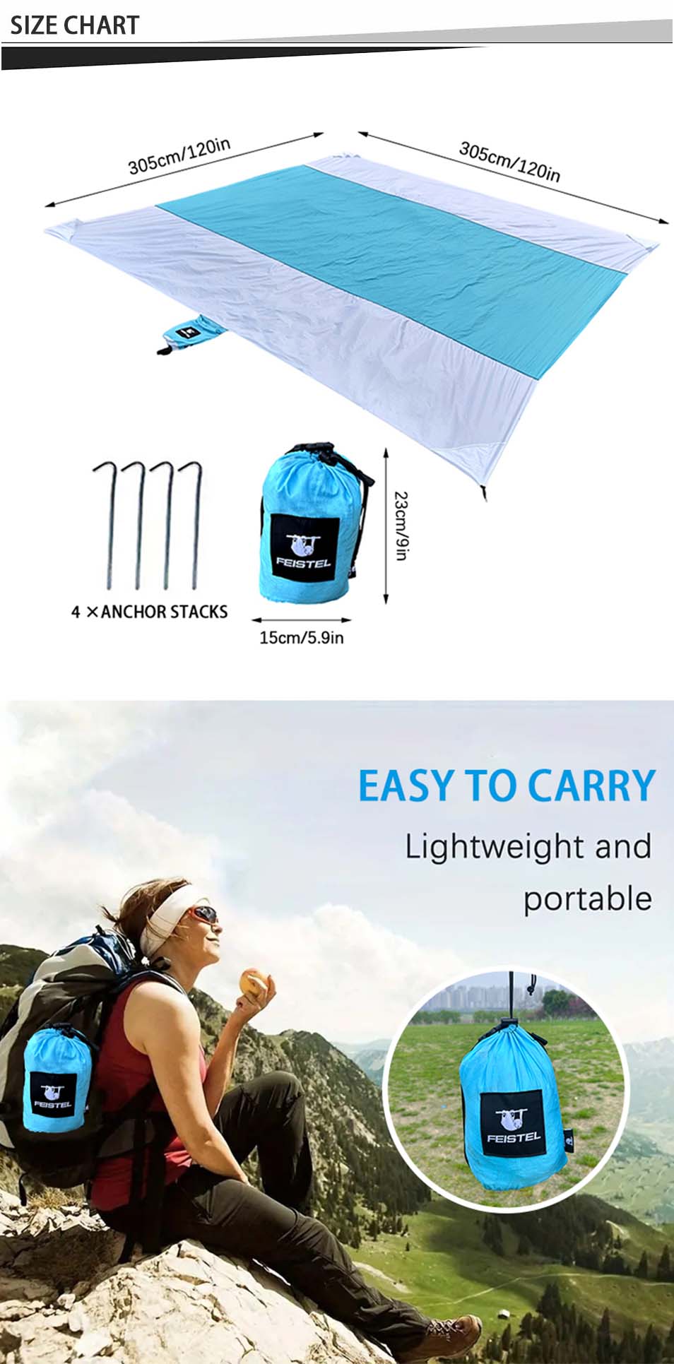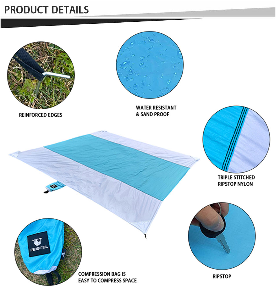 Brand: ANHUI FEISTEL FACTORY Relate Manufacturing: OEM & ODM Product: Durable, extra-large, waterproof, sandproof, foldable beach blanket. Compact, lightweight, easy to carry, ideal for picnics, camping, and beach outings.