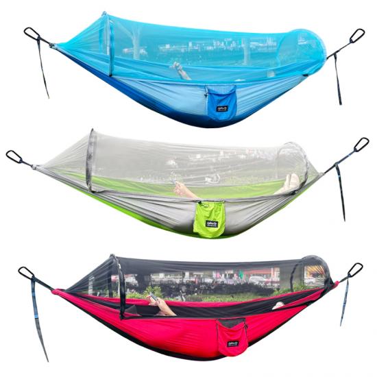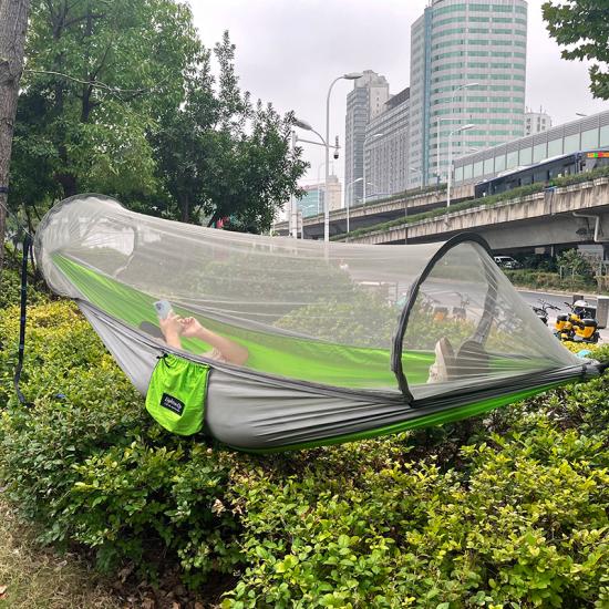 Brand: ANHUI FEISTEL FACTORY Relate Manufacturing: OEM & ODM Product: Lightweight, durable hammock with integrated mosquito net, ideal for backpacking, hiking, and outdoor adventures. Offers protection and easy portability.