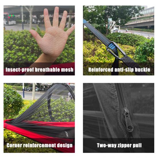 Brand: ANHUI FEISTEL FACTORY Relate Manufacturing: OEM & ODM Product: Lightweight camping hammock with integrated mosquito net, providing excellent protection against bugs, ideal for outdoor adventures and camping.