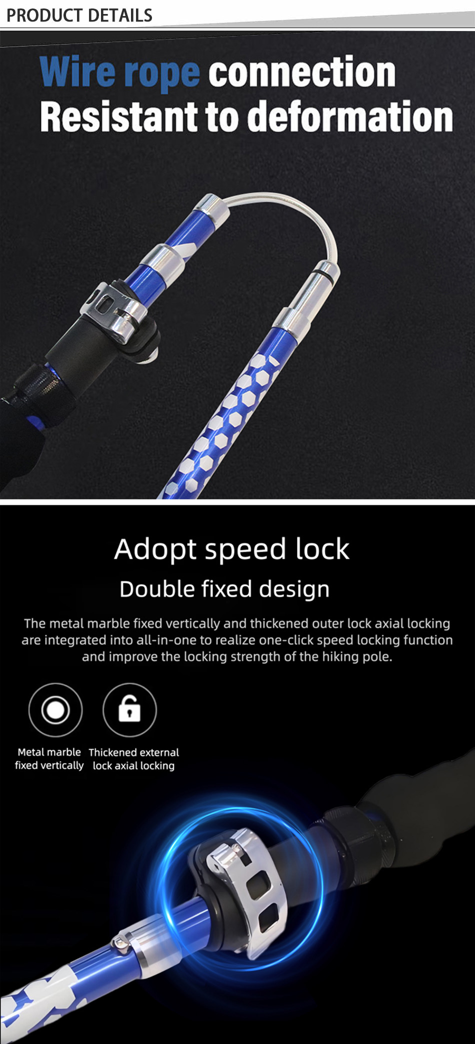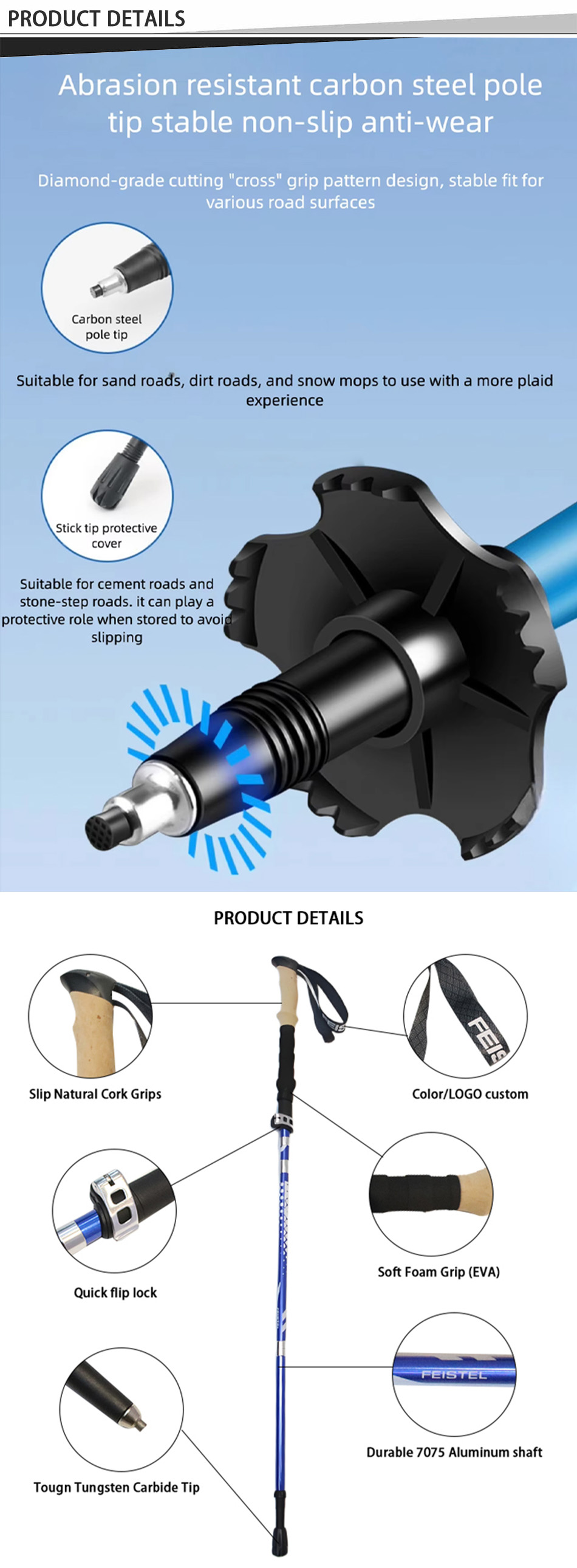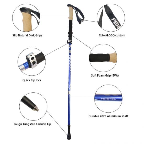 Brand: ANHUI FEISTEL FACTORY Relate Manufacturing: OEM & ODM Product: Lightweight, durable 7075 aluminum trekking poles with foldable design, improving stability, balance, and reducing strain on challenging hikes.