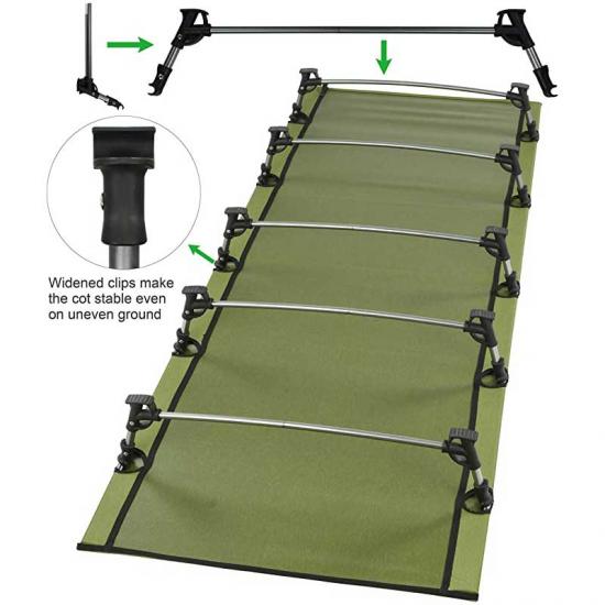 Adjustable camping bed: There are two models of camping bed: high-leg and low-leg.