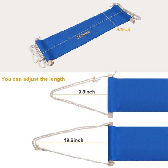 1. The fabric size of this foot hammock is about 65*17cm/25.2x6.7inch, with cotton threads with adjustable length on both sides, the adjustment range is 9.8-19.6inch, according to the required length.