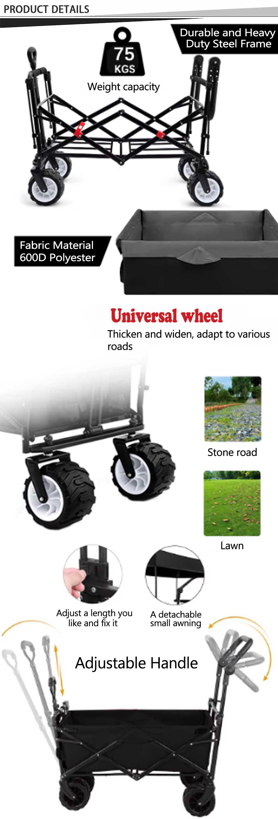 Product: Heavy duty, collapsible, all-terrain utility wagon beach cart ideal for beach outings, camping, and gardening with robust construction, easy portability, and versatile functionality.