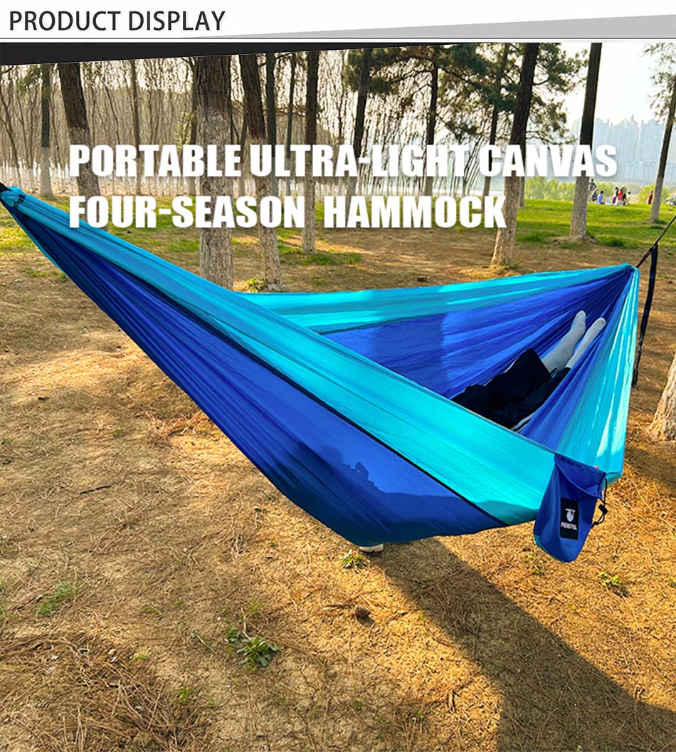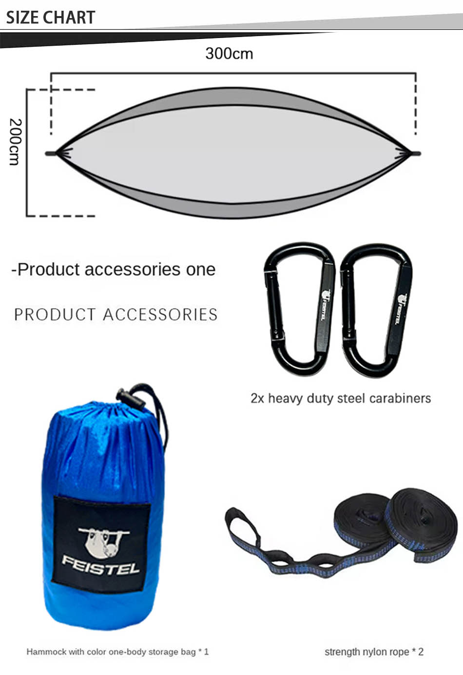 Brand: ANHUI FEISTEL FACTORY Relate Manufacturing: OEM & ODM Product: Durable, lightweight double and single hammocks with two straps, easy setup, ideal for backpacking, travel, or backyard relaxation.