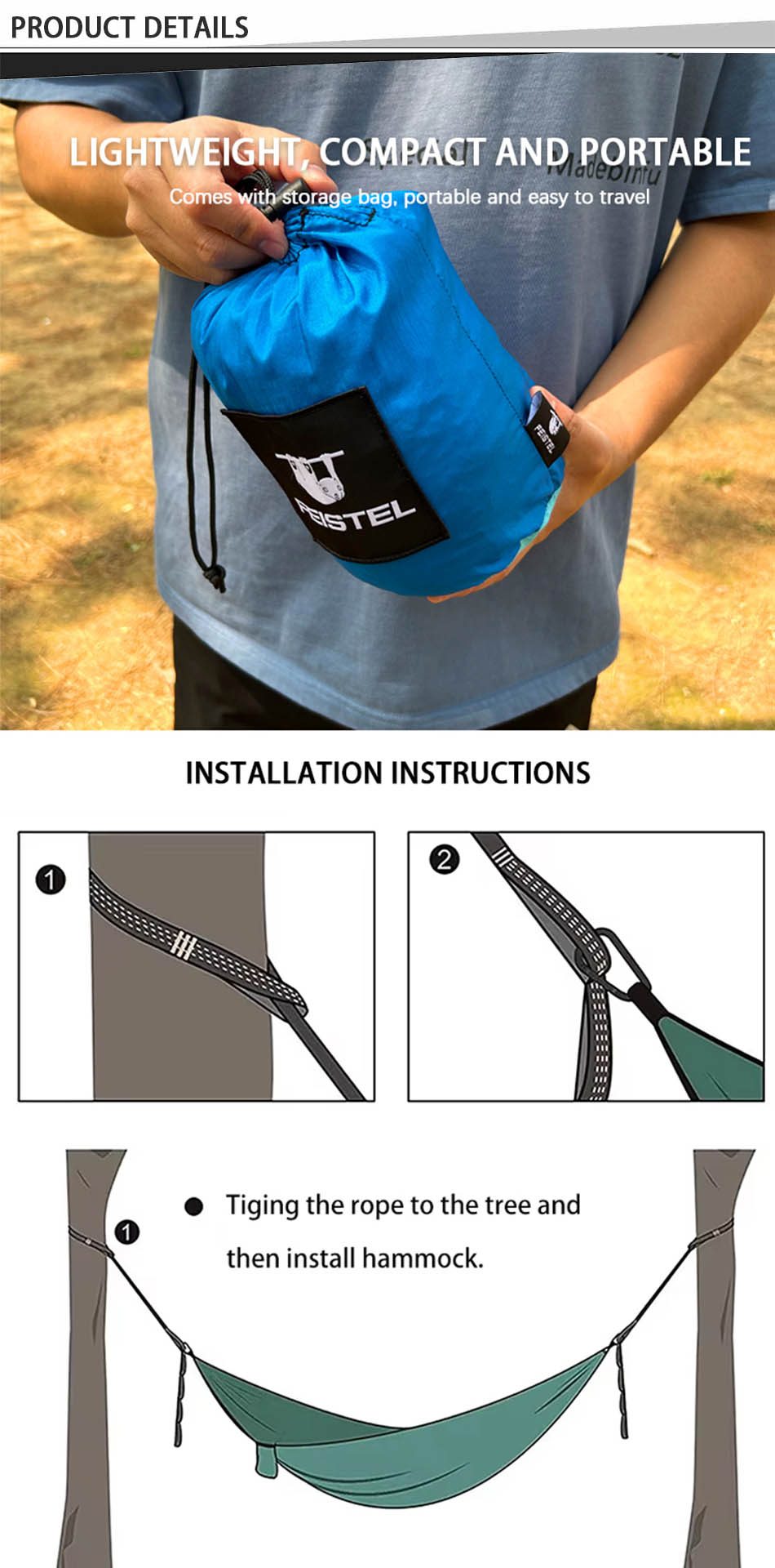 Brand: ANHUI FEISTEL FACTORY Relate Manufacturing: OEM & ODM Product: Camping Hammock Double/Single Portable Hammocks with 2 Tree Straps: Lightweight, durable, easy to set up, perfect for camping, hiking, or relaxing outdoors, supporting ultimate comfort.