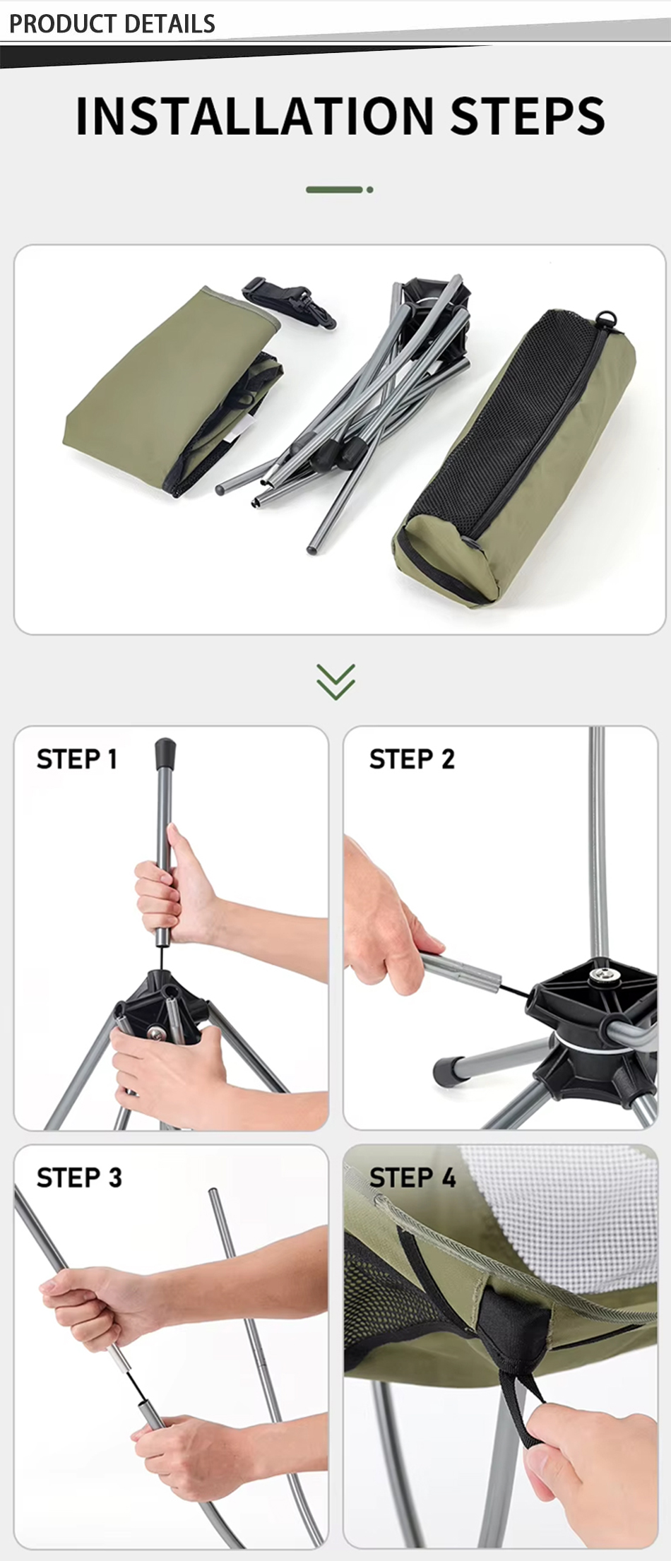 Brand: ANHUI FEISTEL FACTORY Relate Manufacturing: OEM & ODM Product: High Back Ultralight Camping Chair with Carry Bag, perfect for outdoor adventures, providing comfort, durability, and easy portability.