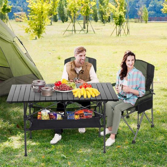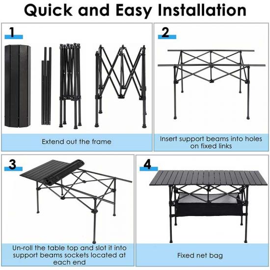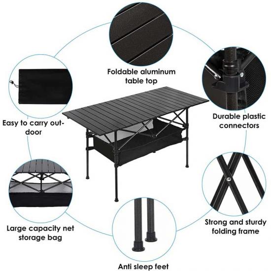 Product: Large, portable aluminum roll-up folding camping table. Ideal for picnics, cooking, and outdoor activities. Lightweight, durable, with adjustable height and easy-to-carry design.