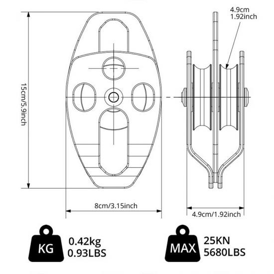This is a Large Rescue Double Pulley, 25KN maximum pulling force, aluminum alloy material, safe and reliable.