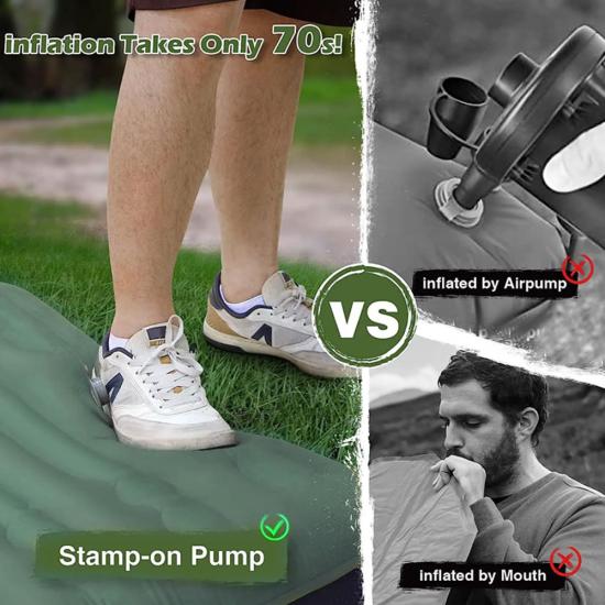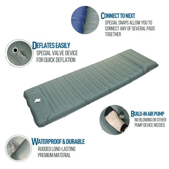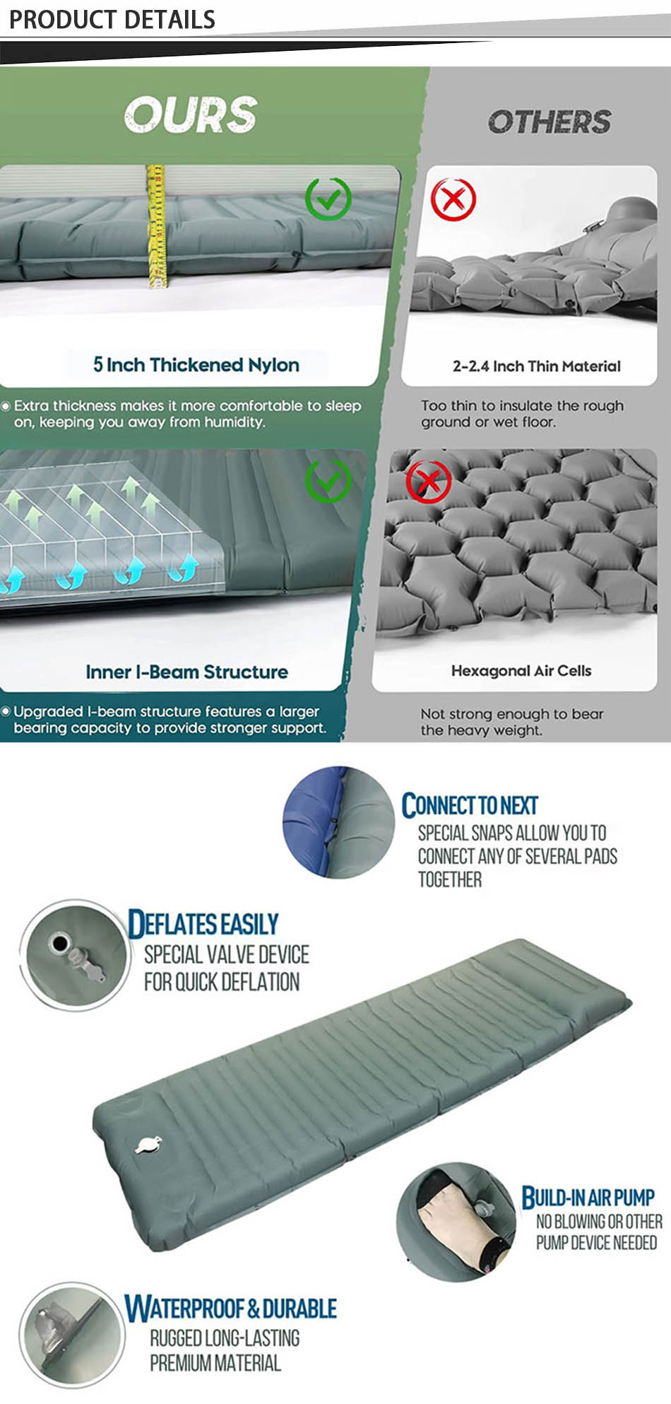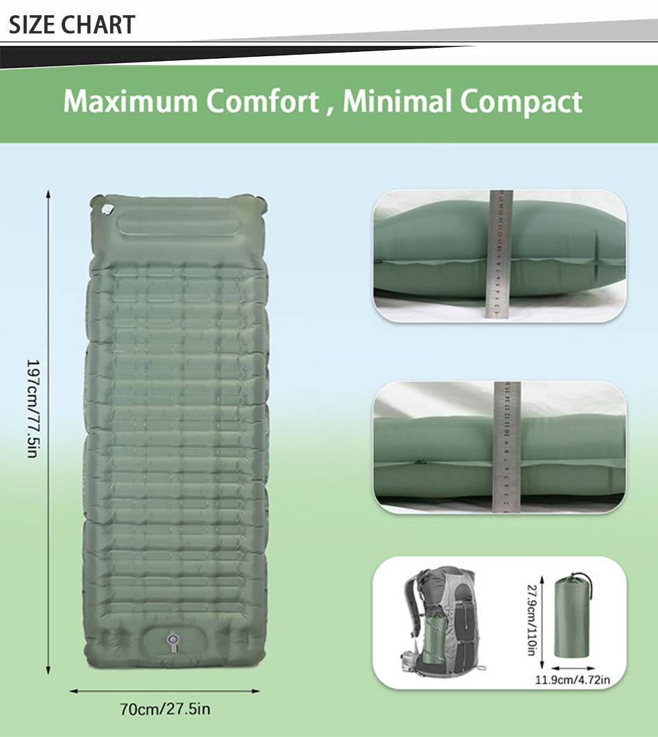 Brand: ANHUI FEISTEL FACTORY Relate Manufacturing: OEM & ODM Product: Durable, self-inflating sleeping pad with splicing capability for customizable comfort, perfect for camping and backpacking in various conditions.