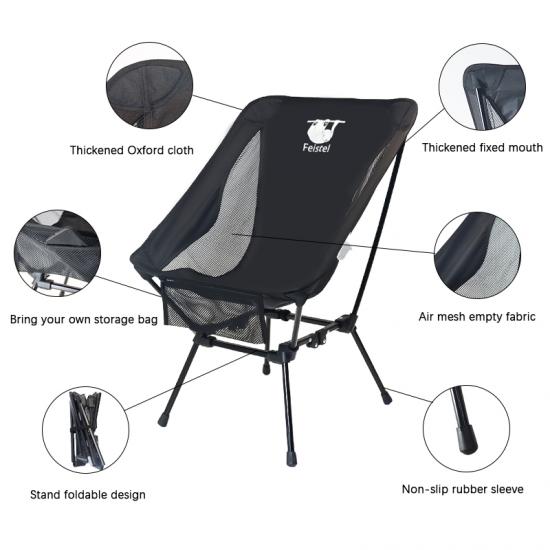 Brand: ANHUI FEISTEL FACTORY Relate Manufacturing: OEM & ODM Product: The Ultra Lightweight Folding Chair combines portability and comfort with a durable aluminum frame, ergonomic moon design, compact folding, and stability—perfect for outdoor adventures!