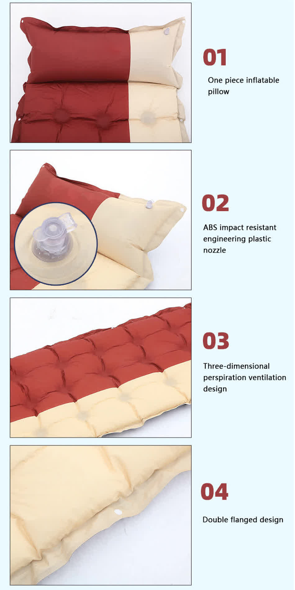Brand: ANHUI FEISTEL FACTORY Relate Manufacturing: OEM & ODM Product: Portable double sleeping mat with built-in air pillow, easy inflation, lightweight, compact, perfect for camping, hiking, and backpacking.