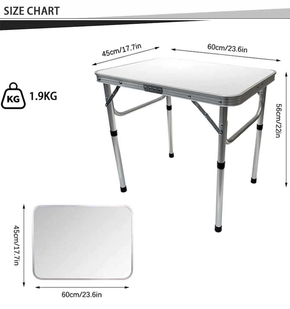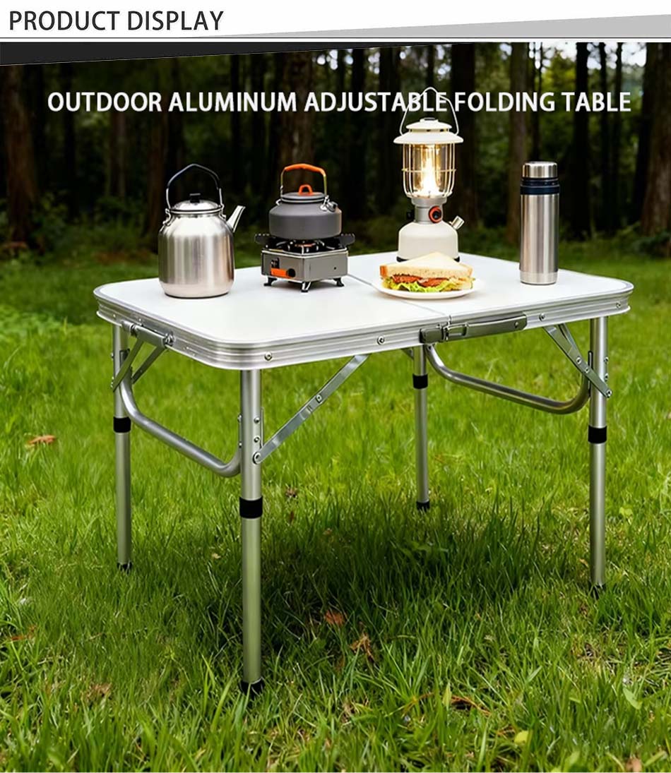 ProductThe outdoor adjustable lightweight portable aluminum folding table is a sturdy, rustproof, and easy-to-clean surface that sets up in seconds, features non-slip legs with three height adjustments, and packs into a compact carry bag for effortless transport to campsites, beaches, tailgates, or backyard parties.