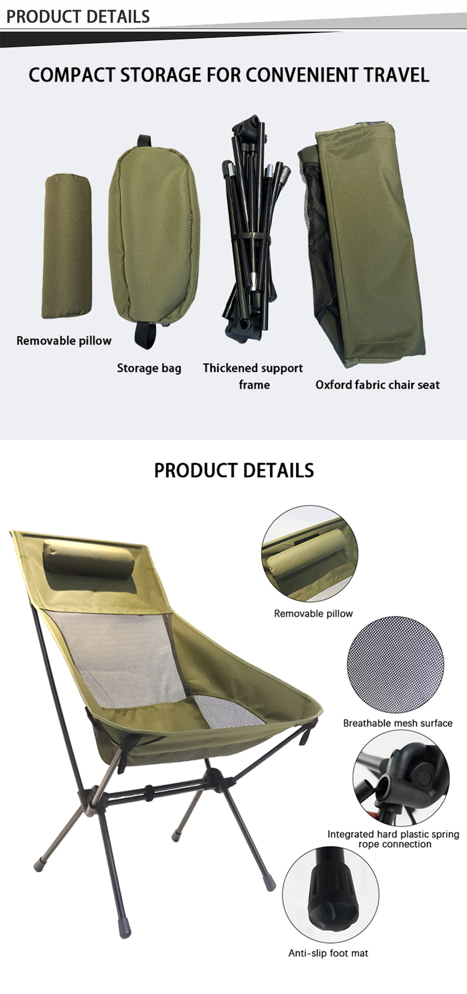 Brand: ANHUI FEISTEL FACTORY Relate Manufacturing: OEM & ODM Product: High Back Ultralight Camping Chair with Carry Bag, perfect for outdoor adventures, providing comfort, durability, and easy portability.