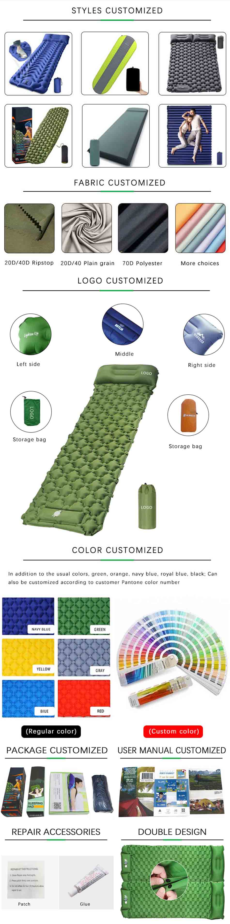 Brand: ANHUI FEISTEL FACTORY Relate Manufacturing: OEM & ODM Product: Portable double sleeping mat with built-in air pillow, easy inflation, lightweight, compact, perfect for camping, hiking, and backpacking.