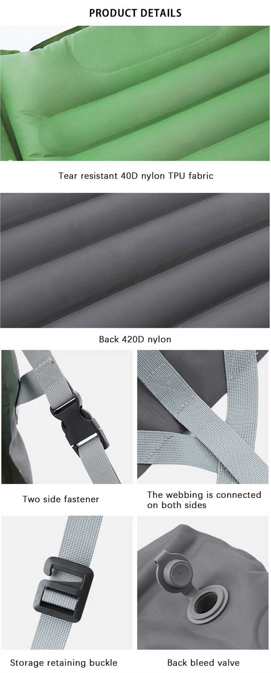 Brand: ANHUI FEISTEL FACTORY Relate Manufacturing: OEM & ODM Product: A compact, lightweight sleeping pad ideal for camping, offering portability, insulation, and comfort for backpackers seeking efficient gear.