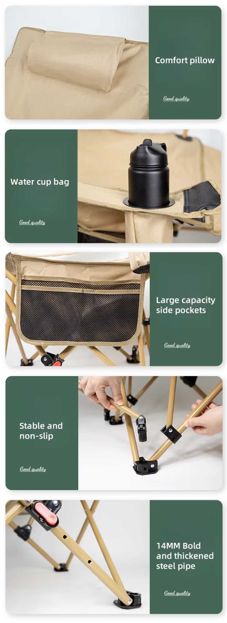 Brand: ANHUI FEISTEL FACTORY Relate Manufacturing: OEM & ODM Product: This portable camping chair features a lightweight, foldable design with durable construction and convenient side pockets, perfect for beach trips, camping, and outdoor relaxation.