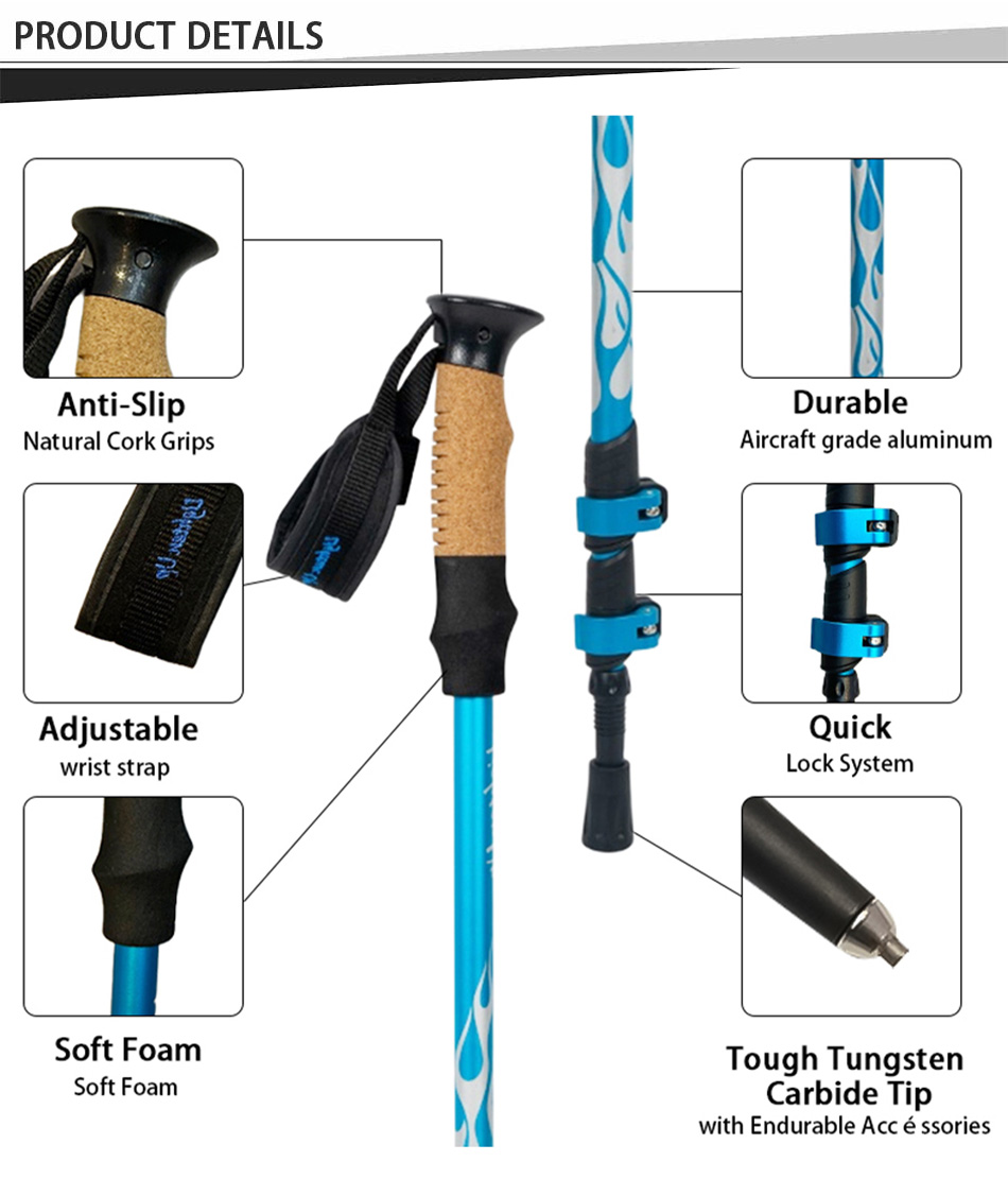 Product: Factory customized lightweight outdoor hiking poles featuring natural cork grips and EVA extensions provide comfort, stability, and durability, offering reliable support for trekking, climbing, and long-distance hiking.