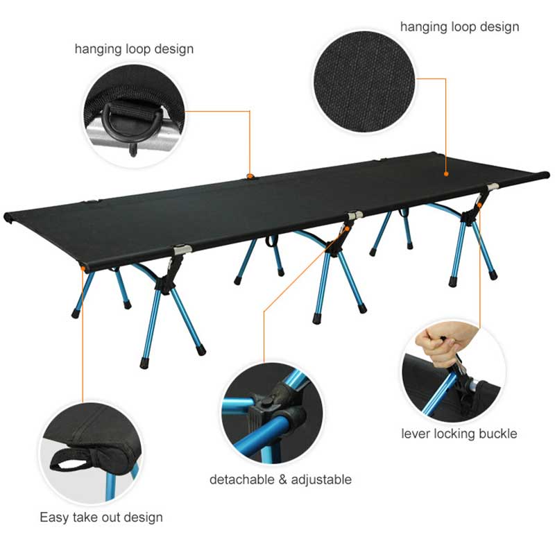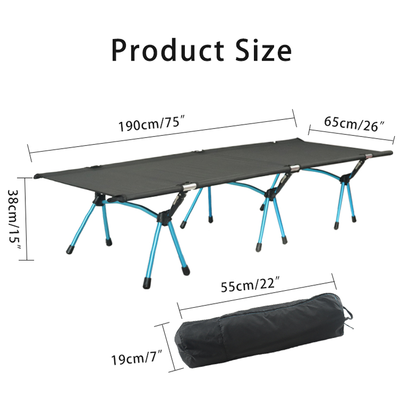 The material of folding bed is 600D Oxford fabric and Aluminum frame, which is breathable, firm and tear-resistant. which is lightweight and durable enough to hold up to 150kg.