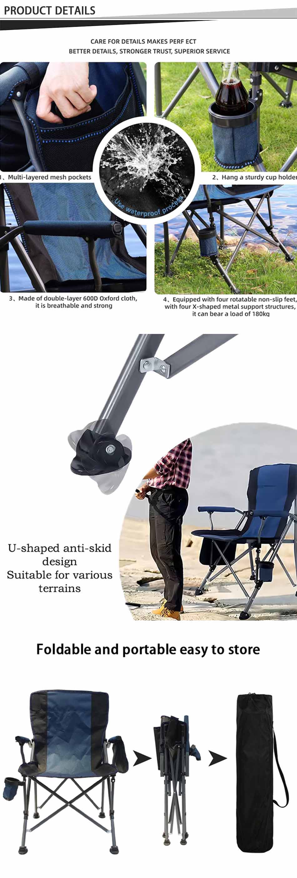 Brand: ANHUI FEISTEL FACTORY Relate Manufacturing: OEM & ODM Product: This portable camping chair features a lightweight, foldable design with durable construction and convenient side pockets, perfect for beach trips, camping, and outdoor relaxation.