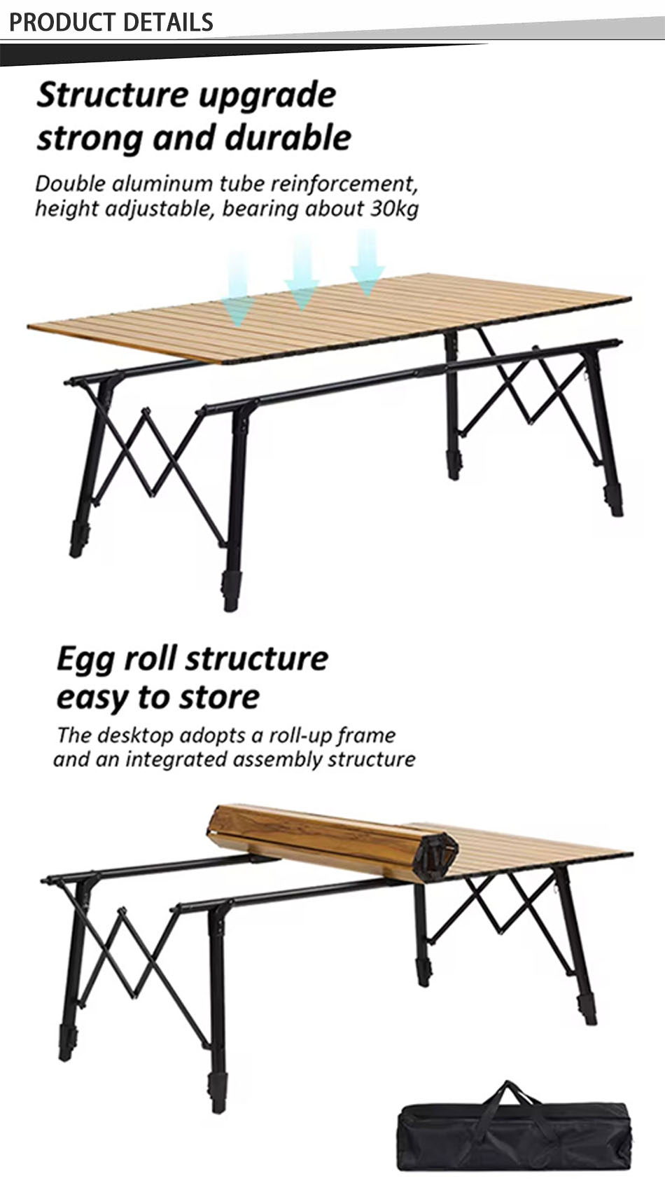 Brand: ANHUI FEISTEL FACTORY Relate Manufacturing: OEM & ODM Product: A lightweight, portable folding table with a stable triangle design, ideal for camping, featuring an egg roll wooden top for easy setup and storage.